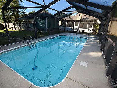 The master bedroom also has french door access to the screened porch overlooking the screened pool. Two additional bedrooms share a hall bathroom with tile flooring, tub/shower combo with tile surround and linen closet. Dedicated laundry room has plenty of extra room for storage inside the home.